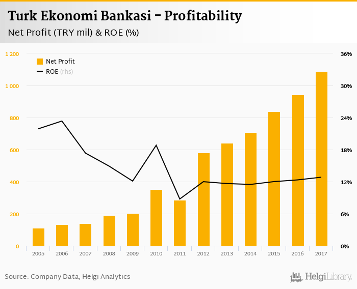 Turk Ekonomi Bankasi made a net profit of TRY 1,088 mil in 2017, up 15.3% compared to the previous year. This implies a return on equity of 12.8%.
