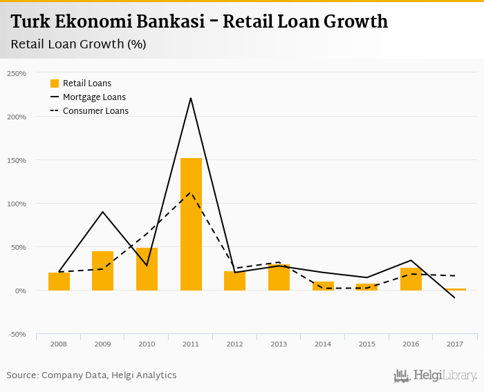 Turk Ekonomi Bankasi's retail loans reached TRY 15,790 mil at the end of 2017, up 2.00% compared to the previous year. In the last decade, the average annual loan growth amounted to 0%.