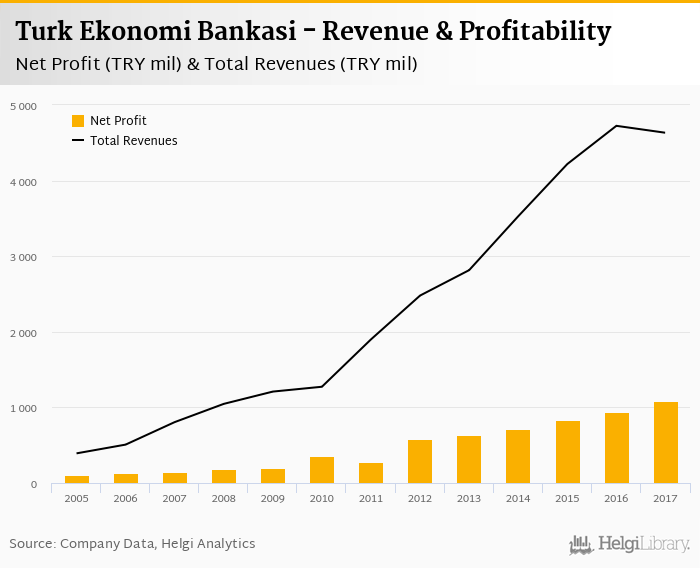 Comparing Turk Ekonomi Bankasi with its closest peers, Isbank generated a net profit of TRY 5,749 mil with revenues of TRY 23,321 mil in 2017, Garanti Bank netted TRY 6,388 mil (revenues of TRY 19,655 mil) and VakifBank announced a net profit of TRY 3,910 mil (revenues of TRY 12,509 mil).