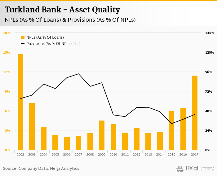 Turkland Bank's non-performing loans reached 11.4% of total loans at the end of 2017, up from 6.46% compared to the previous year. Historically, the NPL ratio hit an all time high of 14.7% in 2002 and an all time low of 2.02% in 2006.