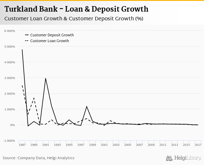 Turkland Bank's customer loan growth reached -19.4% in 2017, down from -8.43% compared to the previous year. Historically, the bank’s loans growth reached an all time high of 2,500% in 1987 and an all time low of -48.4% in 2001. In the last decade, the average annual loan growth amounted to 21.5%.