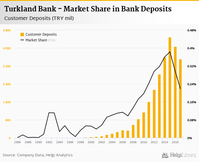 Turkland Bank accounted for 0.218% of all customer deposits taken by banks in Turkey at the end of 2017. Historically, the bank’s market share in customer deposits reached an all time high of 0.383% in 2015 and an all time low of < 0.001% in 1986.