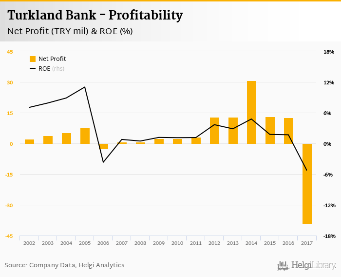 Turkland Bank made a net profit of TRY -39.1 mil in 2017, down 411% compared to the previous year. This implies a return on equity of -5.30%.