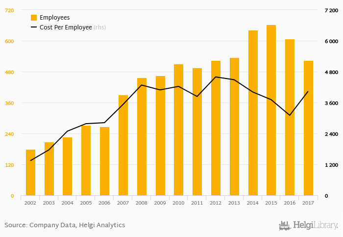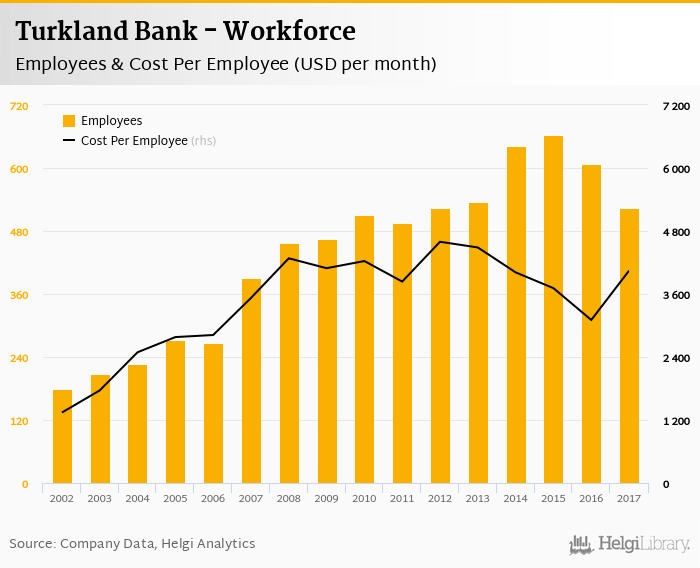 Turkland Bank employed 523 persons in 2017, down 14.0% when compared to the previous year. Historically, the bank's workforce hit an all time high of 662 persons in 2015 and an all time low of 179 in 2002.