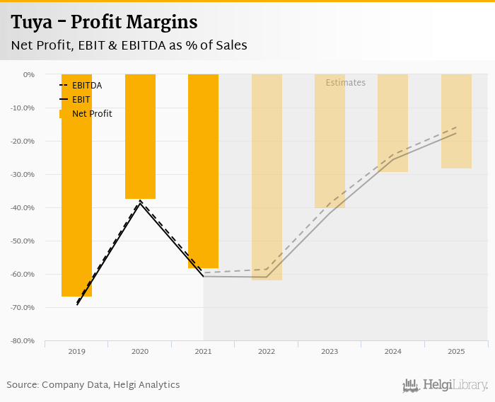 Tuya made a net profit of USD -175 mil with revenues of USD 302 mil in 2021, down by 162% and up by 67.9%, respectively, compared to the previous year.
