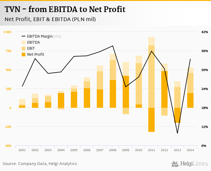 TVN made a net profit of PLN 195 mil with revenues of PLN 1,594 mil in 2014, up by 198% and up by 3.59%, respectively, compared to the previous year. This translates into a net margin of 12.2%.