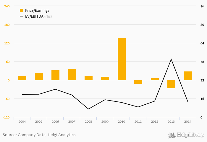 In terms of EV/EBITDA, stock traded at 13.3x at the end of 2014. Since 2009, stock has traded between 8.64x and 49.9x with an average of 19.6x.