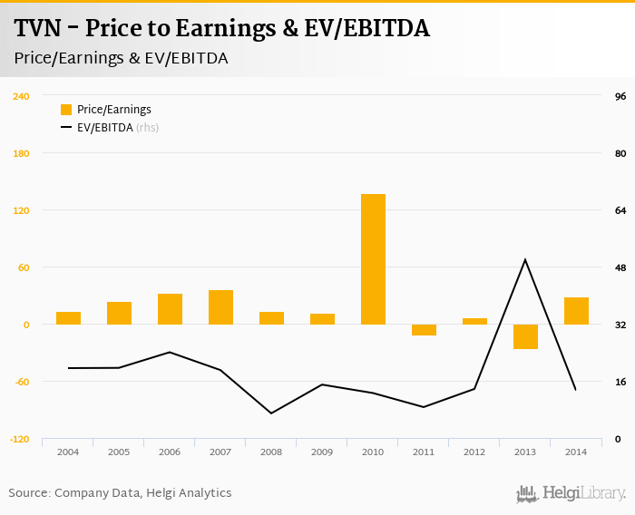 TVN stock traded at PLN 16.2 per share at the end 2014 translating into a market capitalization of USD 1,588 mil.