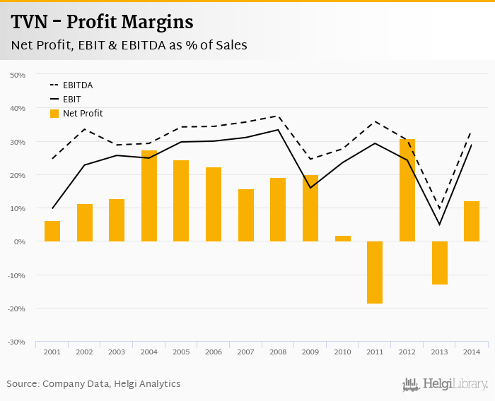 TVN made a net profit of PLN 195 mil with revenues of PLN 1,594 mil in 2014, up by 198% and up by 3.59%, respectively, compared to the previous year.