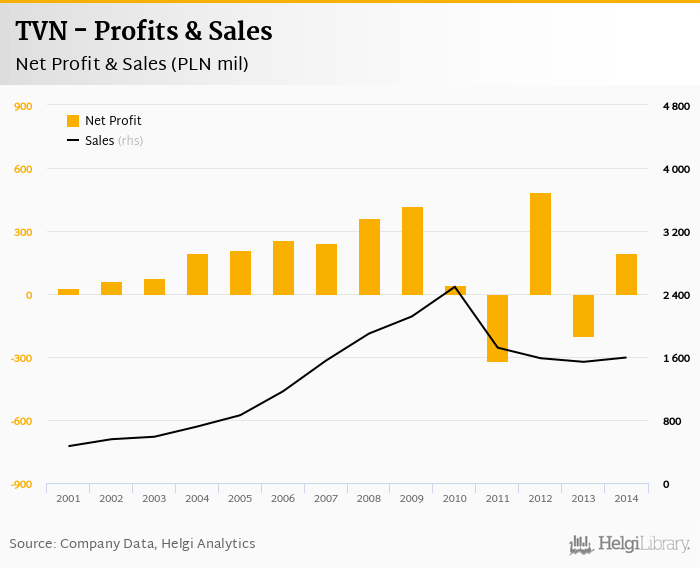 TVN made a net profit of PLN 195 mil in 2014, up 198% compared to the previous year. Total sales reached PLN 1,594 mil, which is up 3.59% when compared to the previous year.