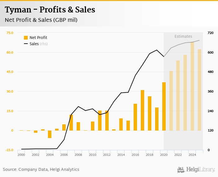Tyman made a net profit of GBP 37.2 mil in 2020, up 110% compared to the previous year. Total sales reached GBP 573 mil, which is down 6.66% when compared to the previous year.