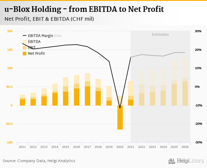 u-Blox Holding made a net profit of CHF 15.3 mil with revenues of CHF 414 mil in 2021, up by 124% and up by 24.2%, respectively, compared to the previous year. This translates into a net margin of 3.70%.
