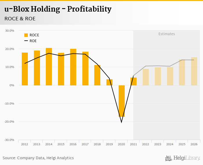 u-Blox Holding made a net profit of CHF 15.3 mil in 2021, up 124% compared to the previous year. Historically, between 2011 and 2021, the company's net profit reached a high of CHF 51.3 mil in 2017 and a low of CHF -64.6 mil in 2020.