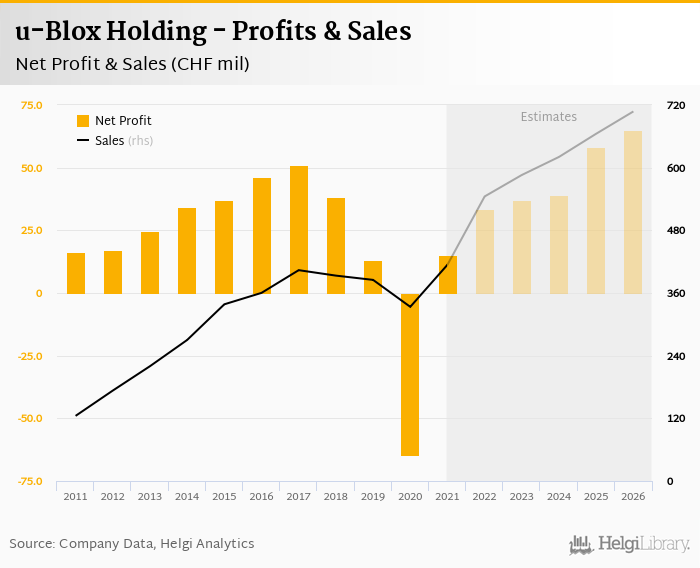 u-Blox Holding made a net profit of CHF 15.3 mil in 2021, up 124% compared to the previous year. Total sales reached CHF 414 mil, which is up 24.2% when compared to the previous year.