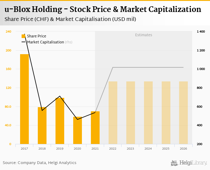 u-Blox Holding stock traded at CHF 70.5 per share at the end 2021 implying a market capitalization of USD 535 mil.