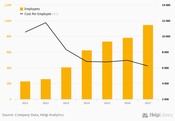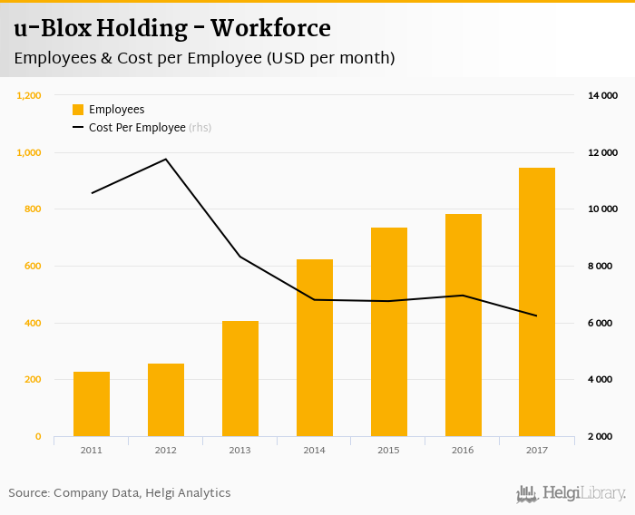 u-Blox Holding employed 947 employees in 2017, up 20.5% compared to the previous year. Historically, between 2011 and 2017, the firm's workforce hit a high of 947 employees in 2017 and a low of 229 employees in 2011.