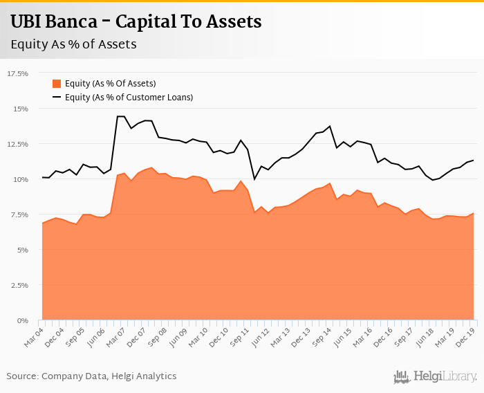 UBI Banca's Equity reached 12.5% of total assets in the 4Q2019, up from 12.1% for the previous year. As a share of net customer loans, the ratio amounted to 22.4% at the end of the fourth quarter of 2019.