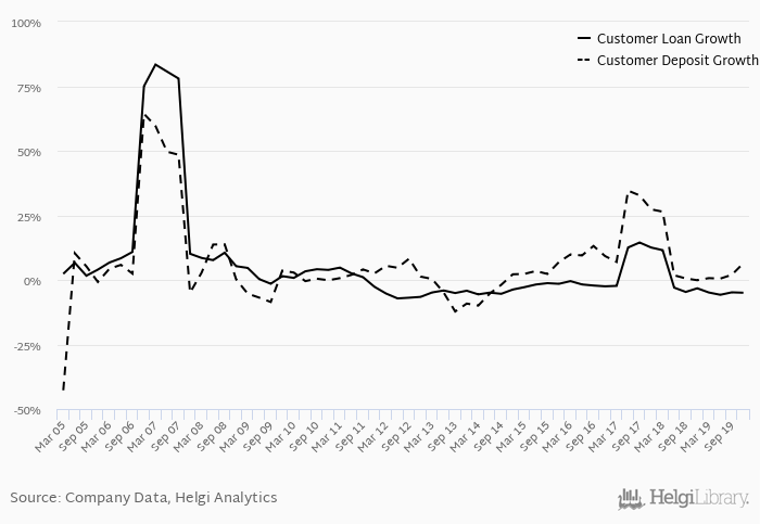 On the other hand, bank's customer deposit growth amounted to 6.45% at the end of 2019-12-31, up from -0.126% when compared to the previous year. Historically, the bank’s deposit growth reached an all time high of 64.3% in 2006-12-31 and an all time low of -42.8% in 2005-03-31. In the last decade, the average annual loan growth amounted to 4.28%.