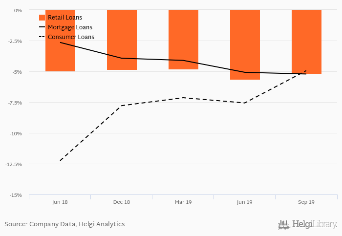 Mortgage loans fell 1.48% to EUR 57,173 mil in 2019-09-30 and accounted for 77.9% of the retail loan portfolio.