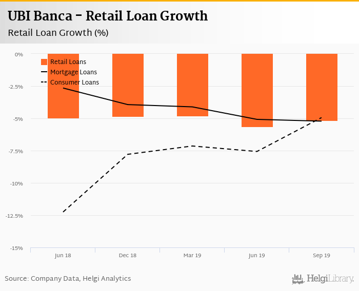 UBI Banca's retail loans reached EUR 73,424 mil at the end of 2019-09-30, down 1.12% compared to the previous year. In the last decade, the average annual loan growth amounted to 0%.