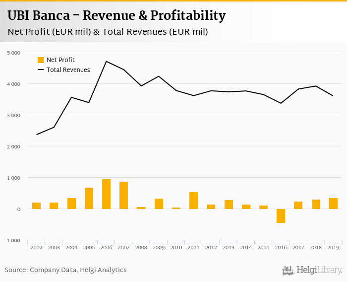 UBI Banca made a net profit of EUR 353 mil under revenues of EUR 3,598 mil in 2019, up 16.676751344899% and -8.1197388852566% respectively compared to the previous year.
