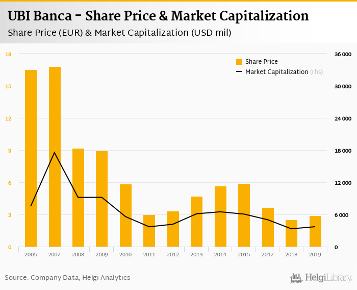UBI Banca stock traded at EUR 2.91 per share at the end of 2019 implying a market capitalization of USD 3,711 mil.