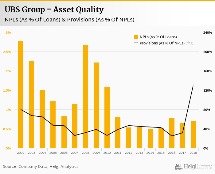 UBS Group's non-performing loans reached 0.711% of total loans at the end of 2018, up from 0.654% compared to the previous year. Historically, the NPL ratio hit an all time high of 2.79% in 2002 and an all time low of 0.506% in 2014.