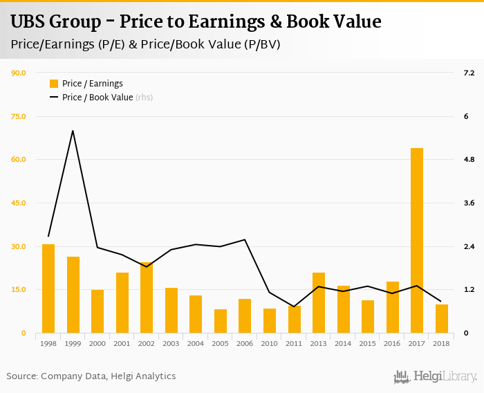 At the end of 2018, the bank traded at price to earnings of 10.2x. Within the last five years, the multiple reached an all time high of 64.1x in 2017 and an all time low of 10.2x in 2018 with an average of 24.0x.