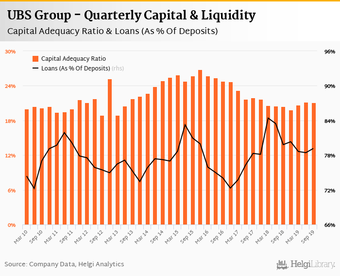 UBS Group's capital adequacy ratio reached 21.1% at the end of third quarter of 2019, down from 21.2% when compared to the previous quarter. Historically, the bank’s capital ratio hit an all time high of 26.8% in 4Q2015 and an all time low of 18.9% in 1Q2013.