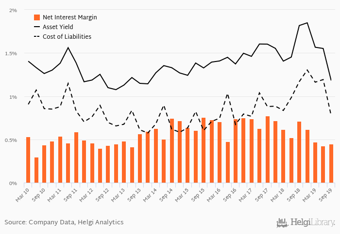Historically, the bank’s net interest margin reached an all time high of 0.774% in 3Q2017 and an all time low of 0.299% in 2Q2010. The average margin in the last six quarters amounted to 0.533%.