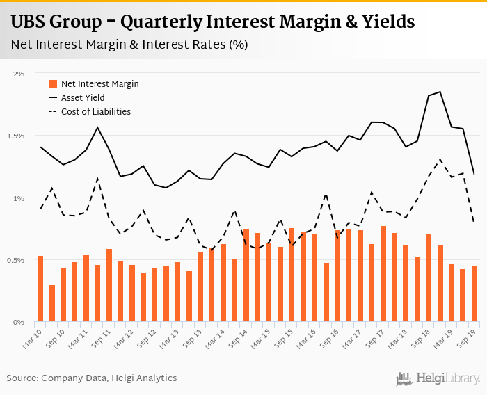 UBS Group's net interest margin amounted to 0.449% in the third quarter of 2019, up from 0.426% when compared to the previous quarter.