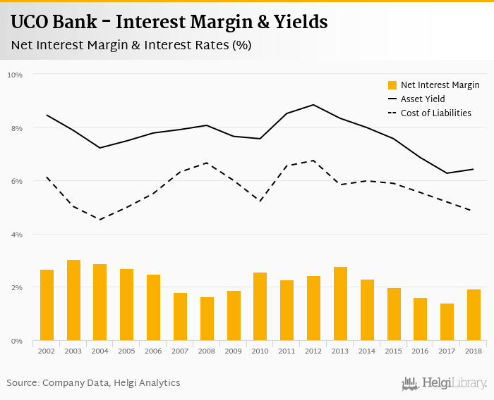 UCO Bank's net interest margin amounted to 1.93% in 2018, up from 1.40% compared to the previous year.