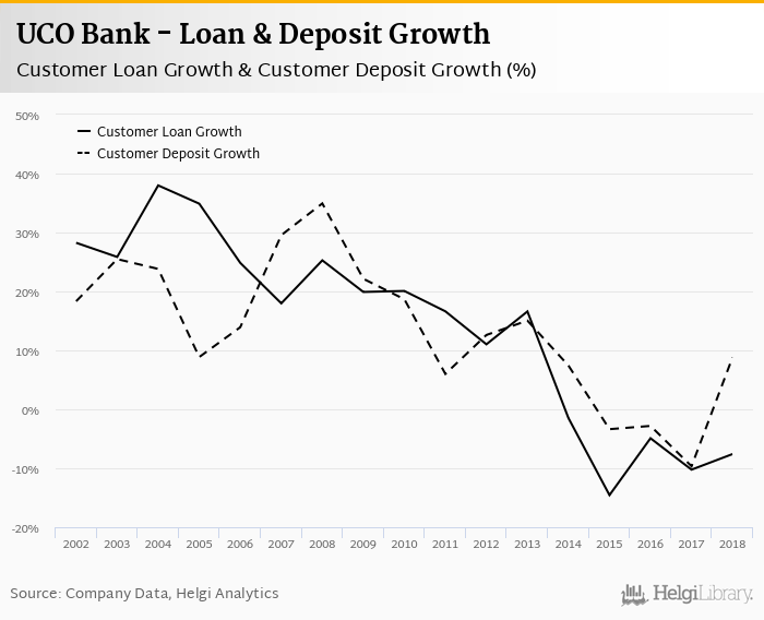 UCO Bank's customer loan growth reached -7.59% in 2018, up from -10.2% compared to the previous year. Historically, the bank’s loans growth reached an all time high of 38.0% in 2004 and an all time low of -14.6% in 2015. In the last decade, the average annual loan growth amounted to 3.74%.