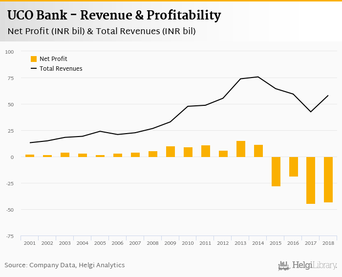 UCO Bank made a net profit of INR -43.2 bil under revenues of INR 58.2 bil in 2018, up 2.60% and 37.0% respectively compared to the previous year.