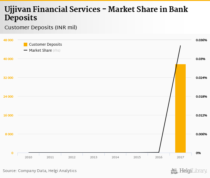 Ujjivan Financial Services accounted for 0.034% of all customer deposits taken by banks in India at the end of 2017. Historically, the bank’s market share in customer deposits reached an all time high of 0.034% in 2017 and an all time low of 0% in 2010.
