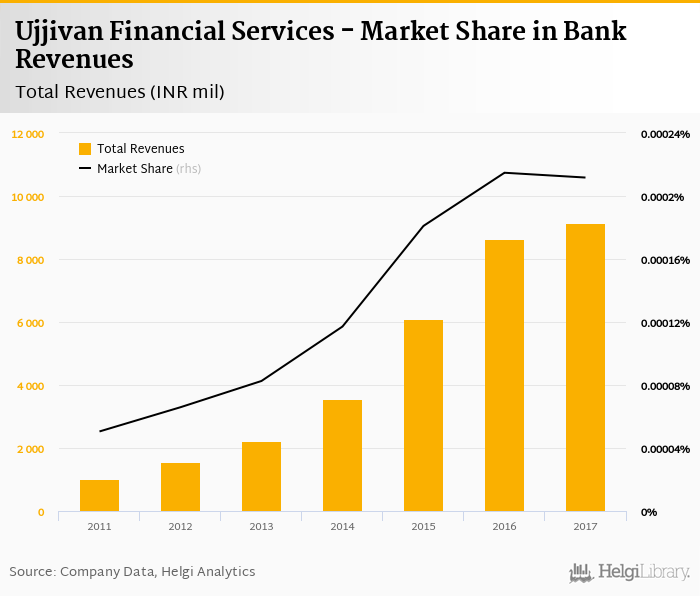 As a result, Ujjivan Financial Services accounted for < 0.001% of all bank revenues generated by banks in India in 2017. Historically, the bank’s market share in total revenues reached an all time high of < 0.001% in 2016 and an all time low of < 0.001% in 2011.
