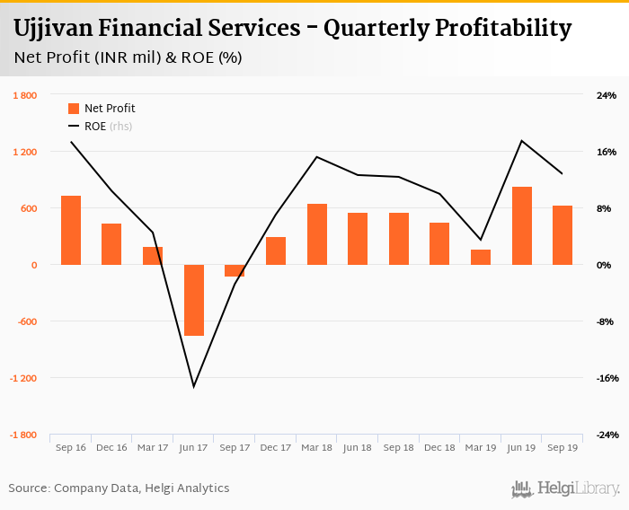 Ujjivan Financial Services made a net profit of INR 632 mil in the third quarter of 2019, up 14.9% when compared to the same period of last year. This implies a return on equity of 12.7%.