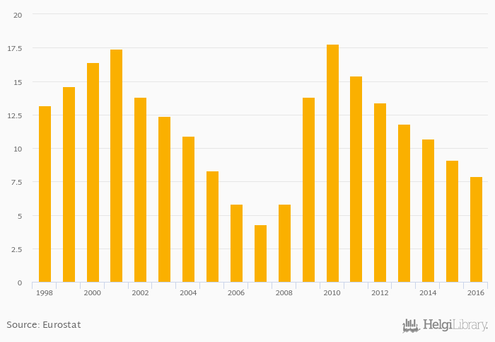 | Unemployment Rate (Eurostat) | Unit | 1997 | 1998 | 1999 | 2000 | 2001 | 2002 | 2003 | 2004 | 2005 | 2006 | 2007 | 2008 | 2009 | 2010 | 2011 | 2012 | 2013 | 2014 | 2015 | 2016 | 2017 |
