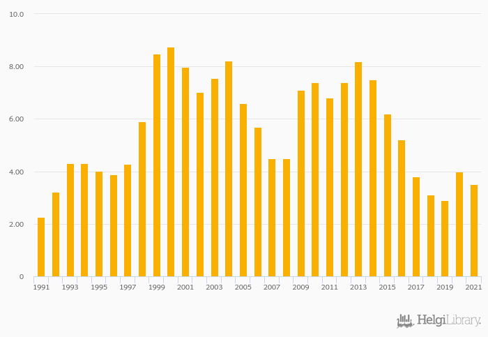 Historically, Unemployment Rate in the Czechia reached an all time high of 8.76% in 2000 and an all time low of 2.27% in 1991. When compared to Czechia's main peers, Unemployment Rate in Austria amounted to 5.00%, 2.67% in Hungary, 3.88% in Poland and 6.21% in Slovakia in 2021.