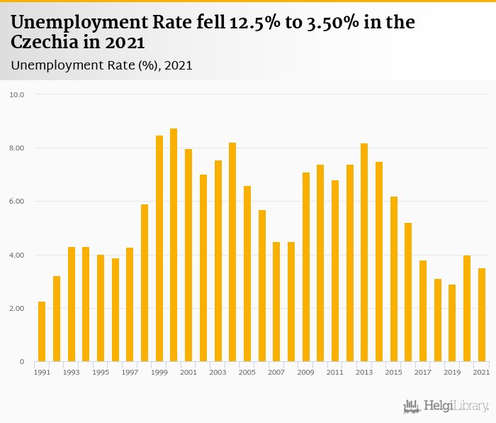 Unemployment Rate fell 12.5% to 3.50% in the Czechia in 2021, according to .