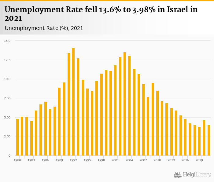 Unemployment Rate fell 13.6% to 3.98% in Israel in 2021, according to .