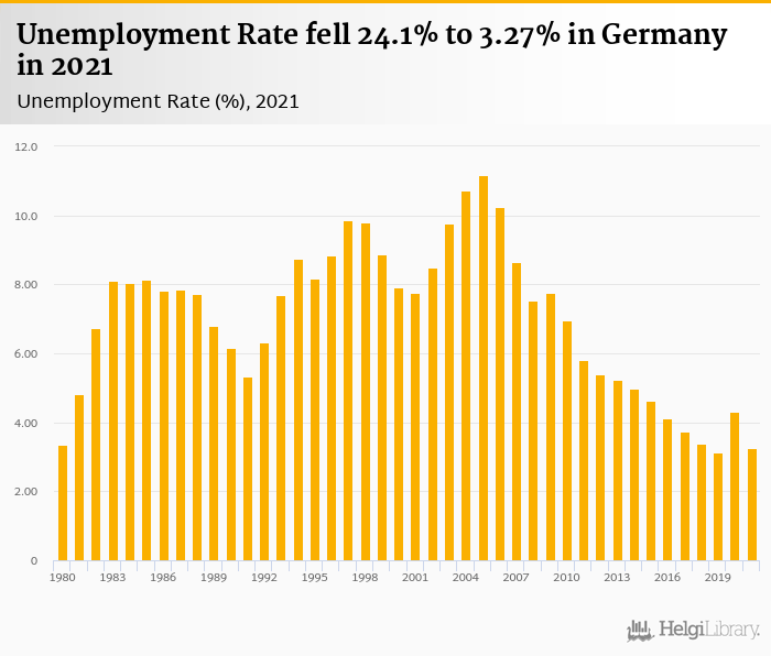 Unemployment Rate fell 24.1% to 3.27% in Germany in 2021, according to .