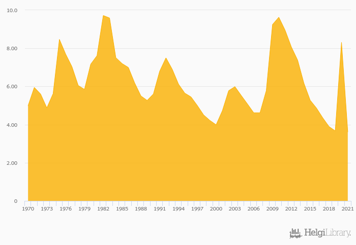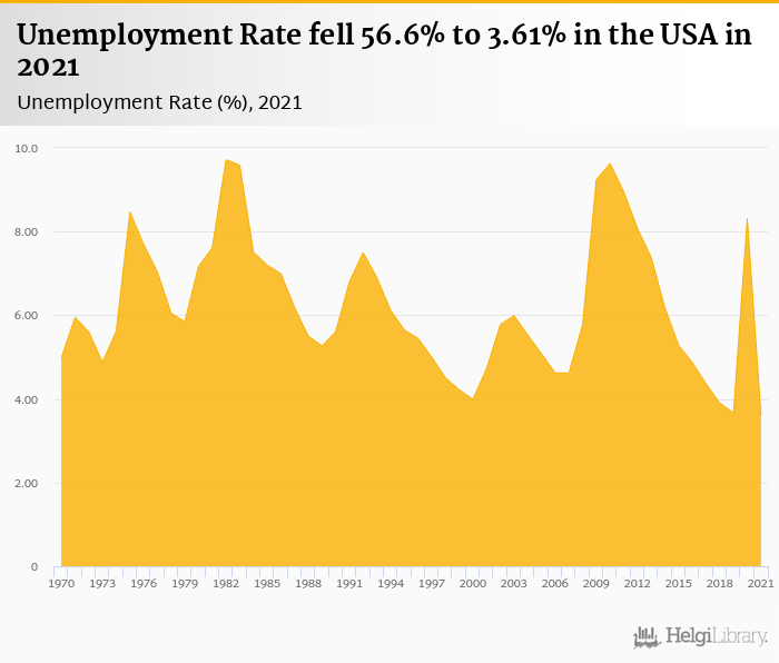 Unemployment Rate fell 56.6% to 3.61% in the USA in 2021, according to .