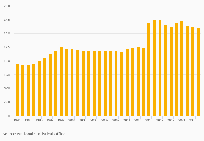 | Yemen | % | 16.6% | 16.2% | 17.0% | 17.3% | 16.4% |