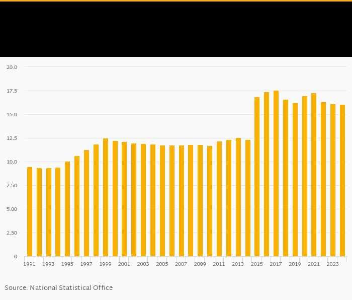 | Somalia | % | 16.2% | 16.3% | 16.9% | 17.1% | 16.5% | ||||||||||||||||