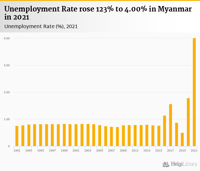 Unemployment Rate rose 123% to 4.00% in Myanmar in 2021, according to .