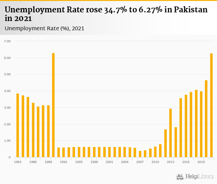 Unemployment Rate rose 34.7% to 6.27% in Pakistan in 2021, according to .