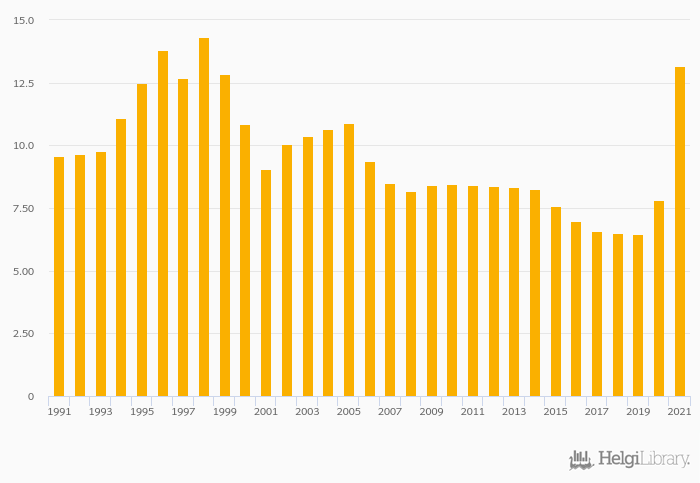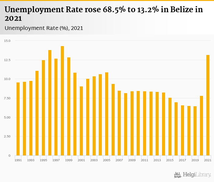 Unemployment Rate rose 68.5% to 13.2% in Belize in 2021, according to .