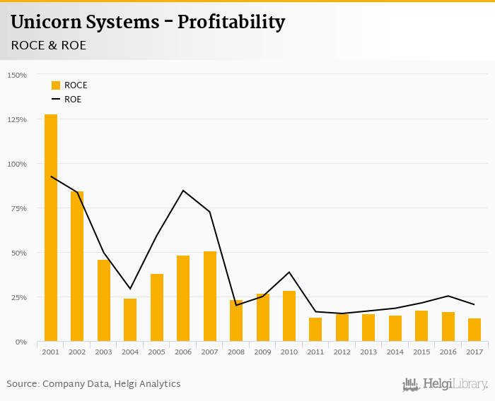 Unicorn Systems made a net profit of CZK 43.5 mil in 2017, down 0.769% compared to the previous year. Historically, between 2000 and 2017, the company's net profit reached a high of CZK 71.7 mil in 2007 and a low of CZK 4.53 mil in 2000.
