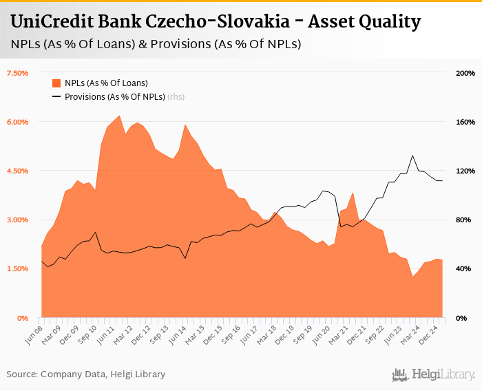 UniCredit Bank Czecho-Slovakia's non-performing loans reached 1.76% of total loans at the end of 2025-03-31, up from 1.42% compared to the previous year. Historically, the NPL ratio hit an all time high of 6.17% in 2011-09-30 and an all time low of 1.22% in 2023-12-31.